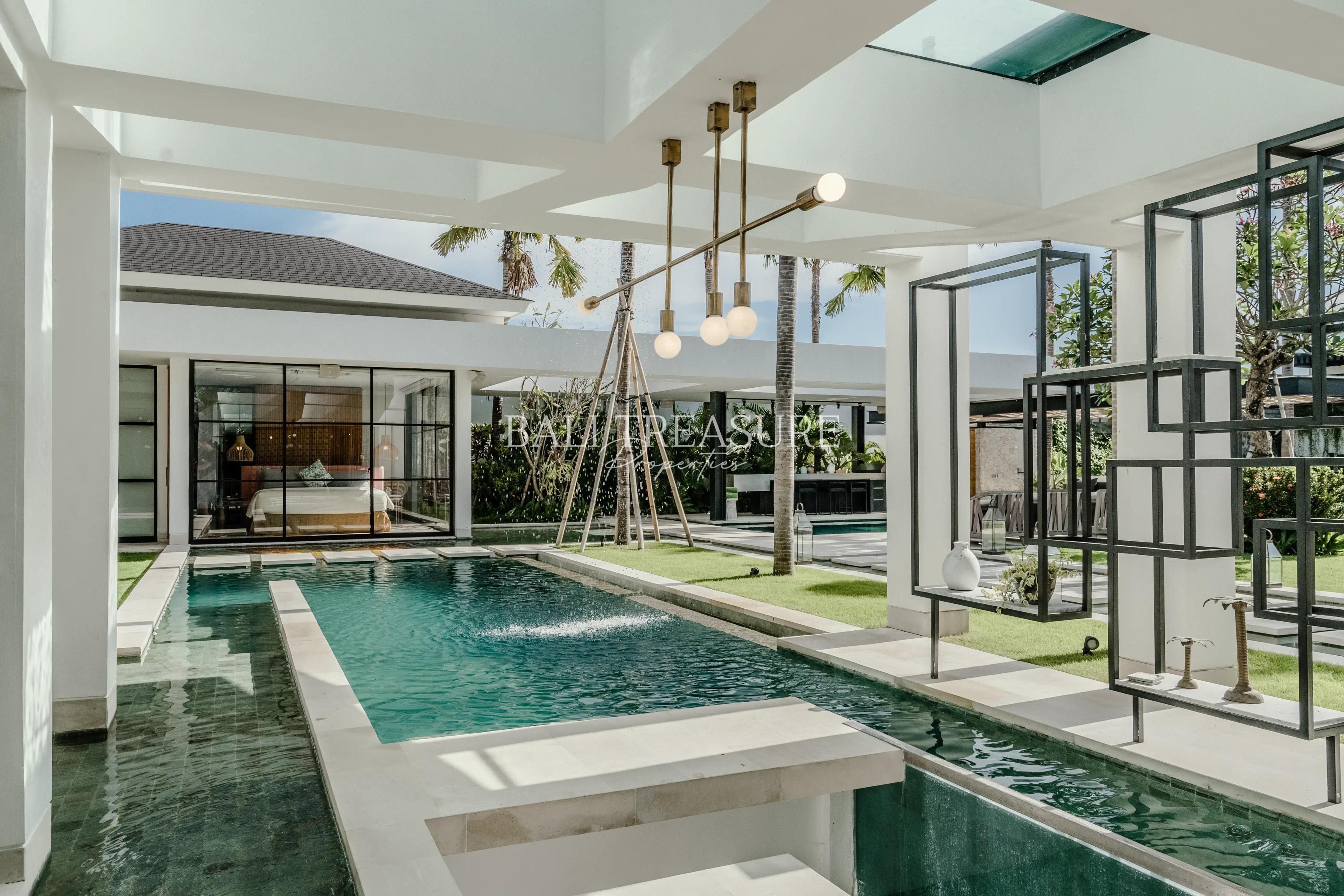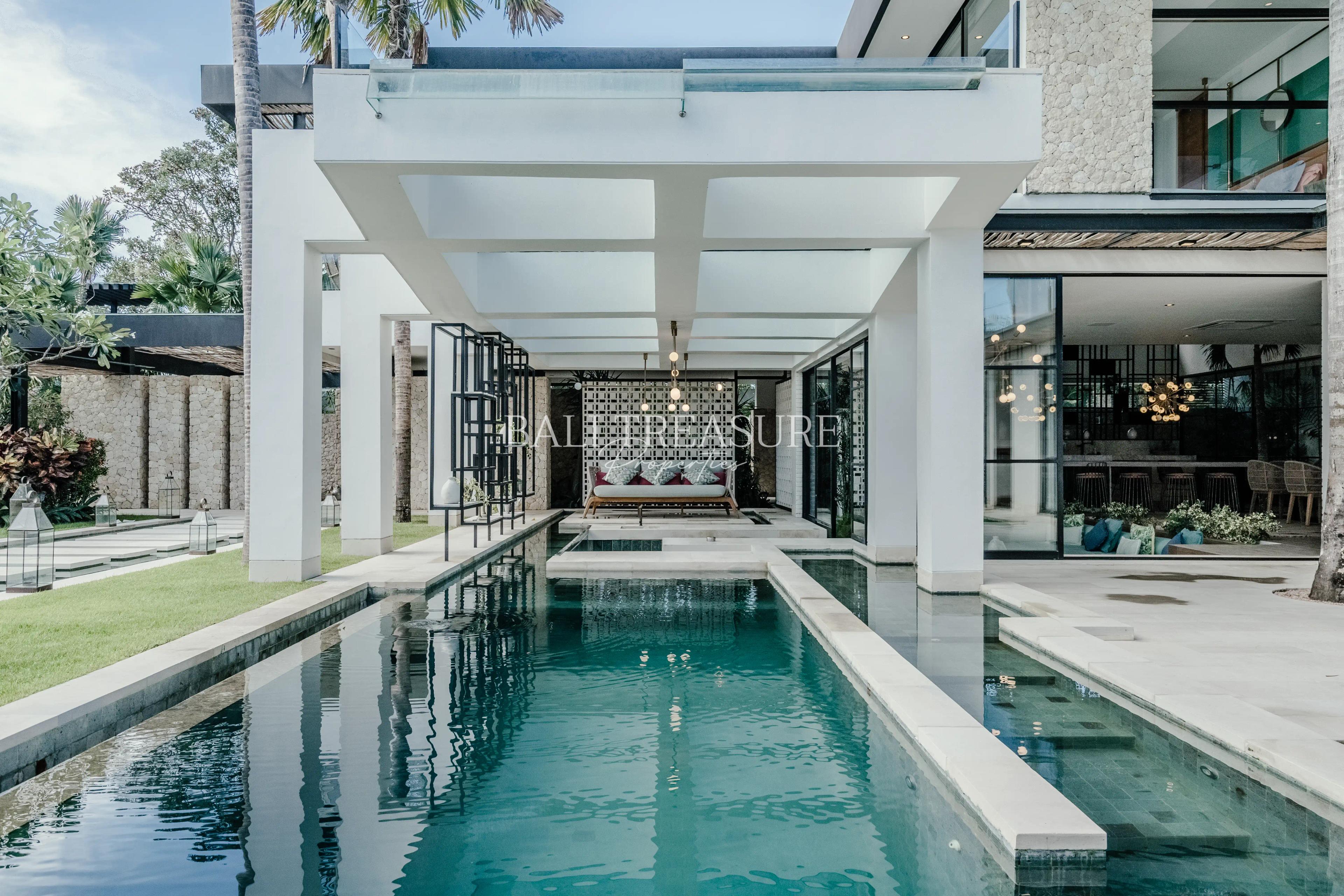 The 5 spacious bedrooms have free-standing tubs, dual rainfall showers, and spacious vanities. Three ground-floor bedrooms are surrounded by multiple lounge areas, two swimming pools, a barbecue area, and a private pool bar.