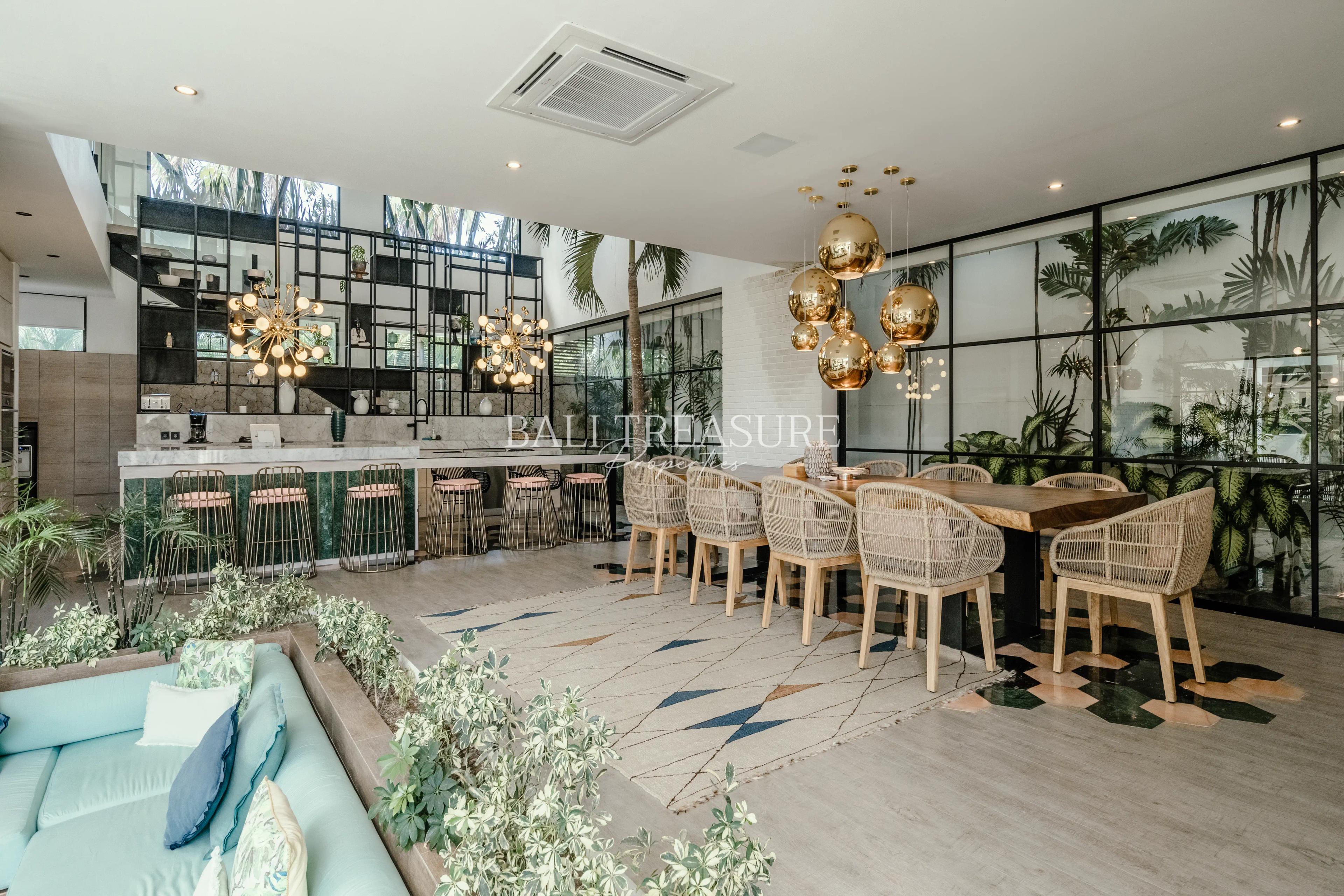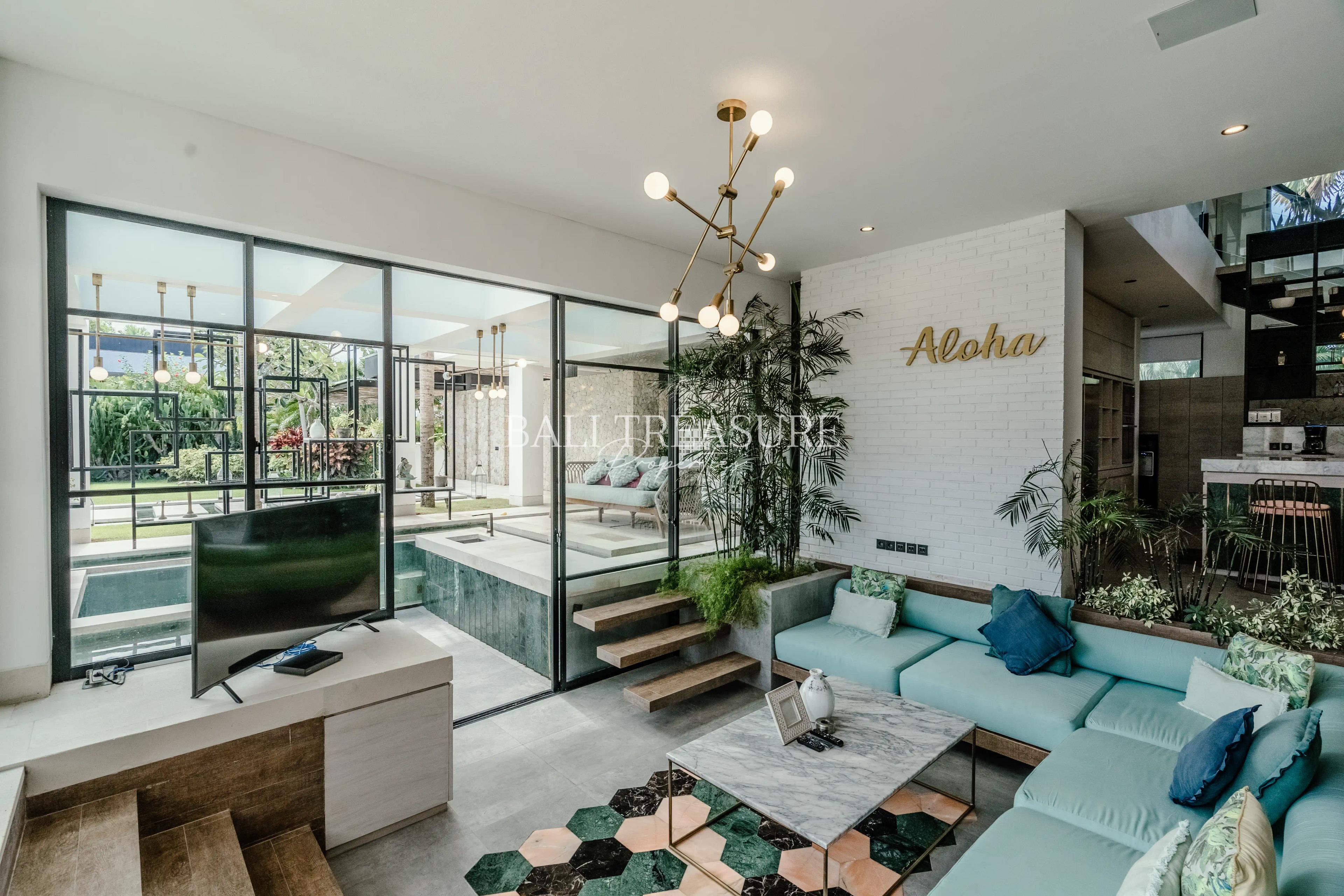 The villa is an elegant open layout, high-beamed ceilings, dramatic waterfall, fully equipped western kitchen, Italian tile, smart TV, and an integrated Bluetooth sound system.