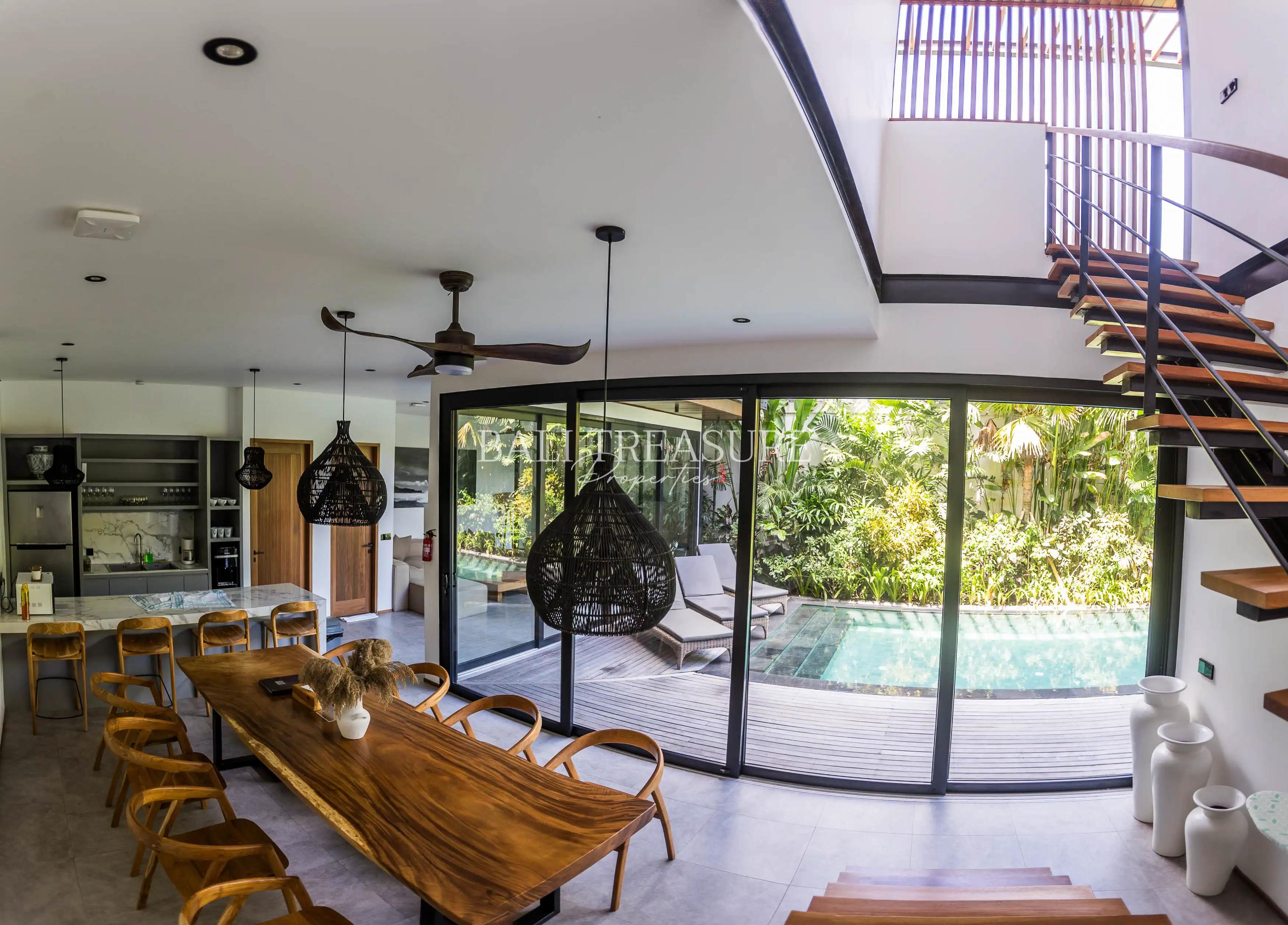 This 4-bedroom villa combines modern luxury with ethnic Balinese influences, creating a unique retreat. All bedrooms have ensuite bathrooms, while the villa boasts an enclosed living room for versatile indoor-outdoor living. Relax by the pool, cook in the fully equipped kitchen, or enjoy your favorite shows on the Smart TVs with Netflix in this serene yet connected space.
