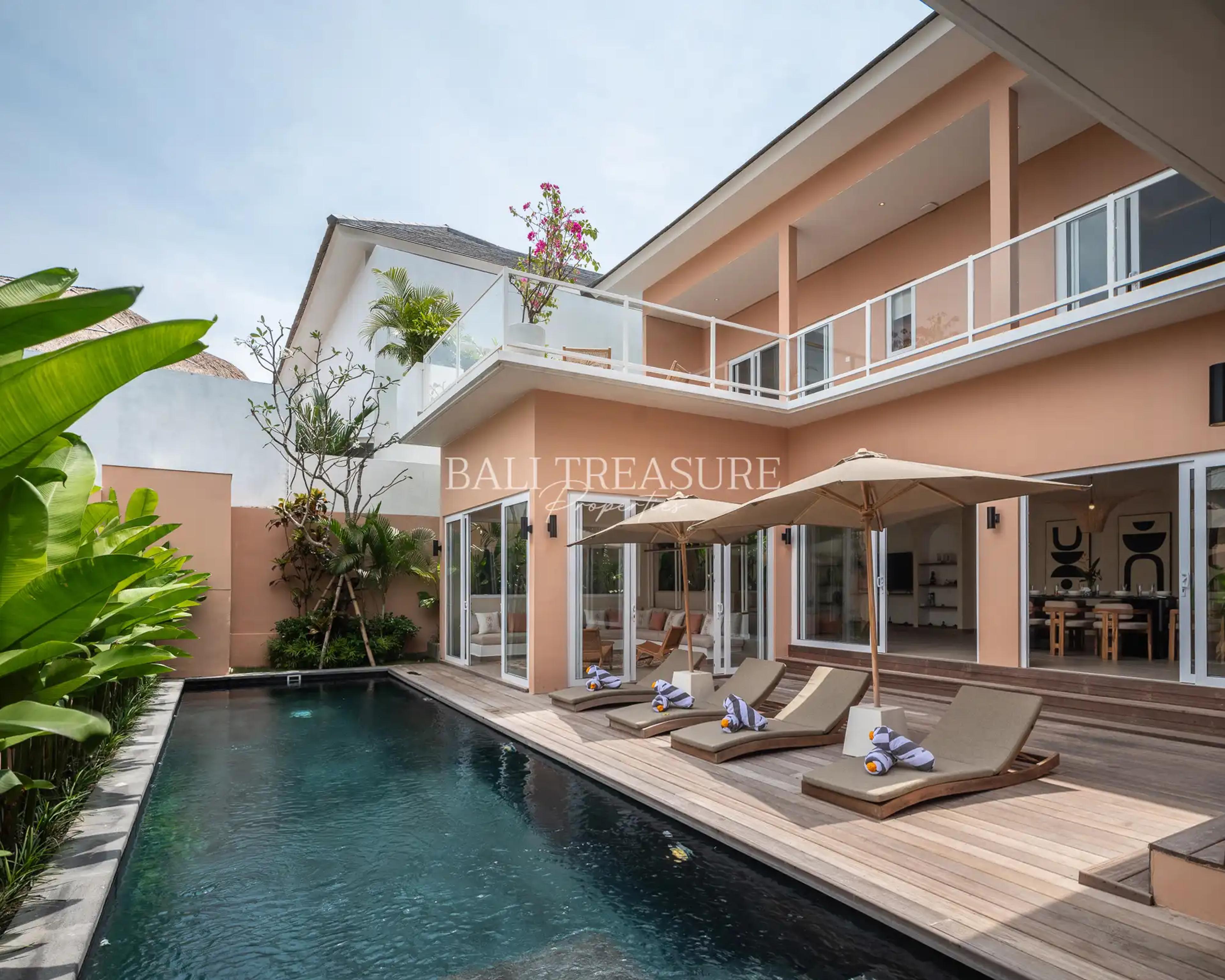 This villa is brand new and has a modern design that is perfect for families. It’s on a 361 sqm plot and has a 300 sqm building. There are four bedrooms, offering plenty of space for everyone. It also features a 33 sqm swimming pool for family fun, a balcony for outdoor activities, a storage room for extra space, and a secure parking garage for safety and convenience.