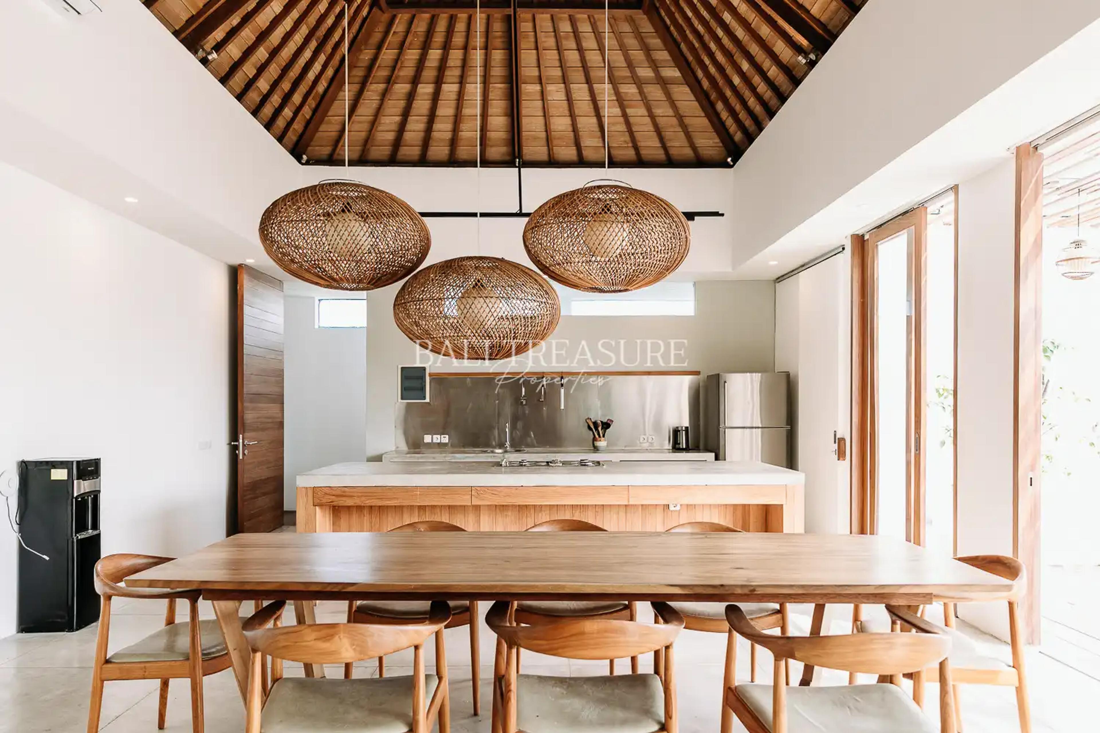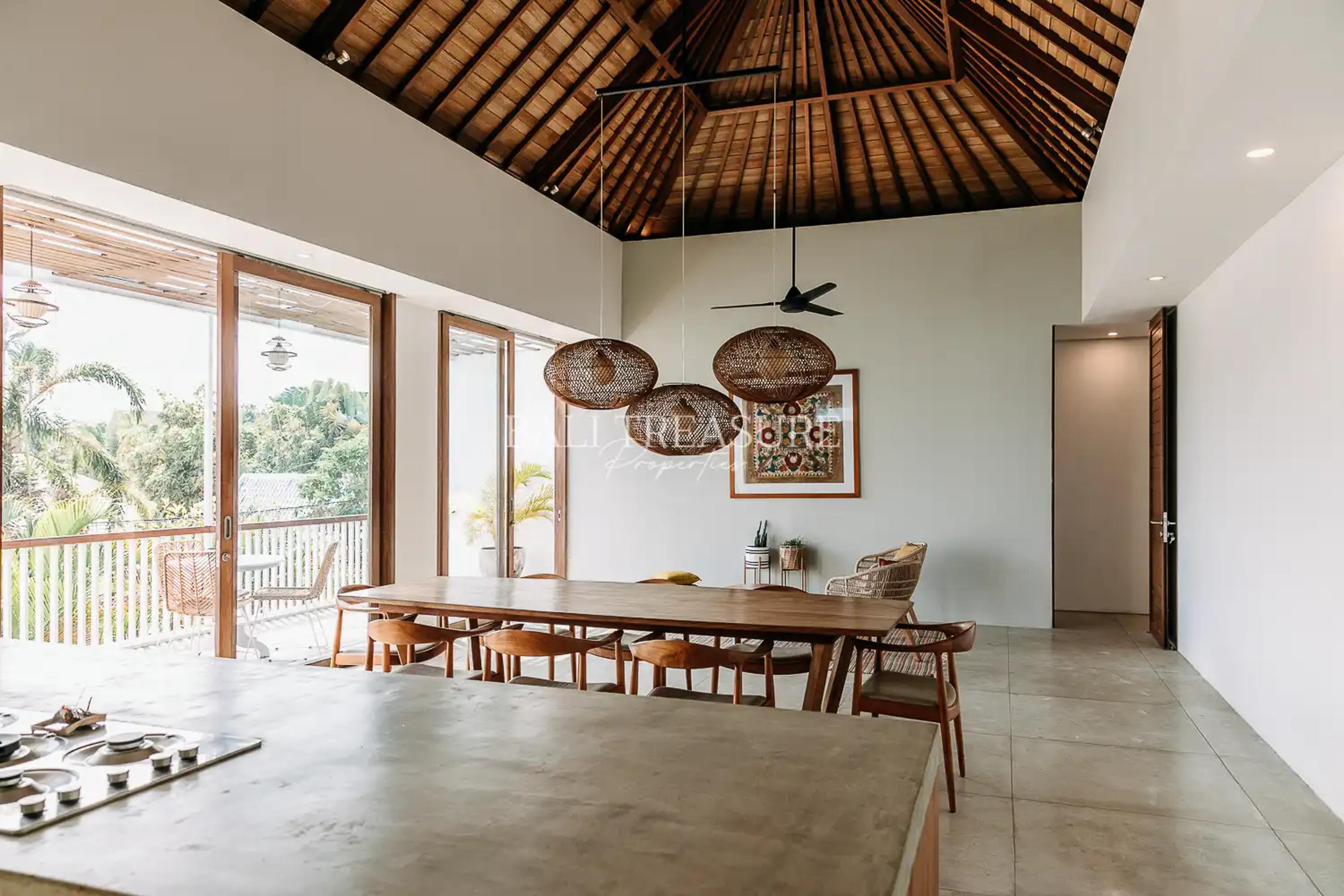 This villa offers a fantastic opportunity for anyone looking to invest in Bali. It is currently offered at USD 695,000 for a 26-year leasehold and comes fully furnished with a modern Balinese interior featuring earthy tones.