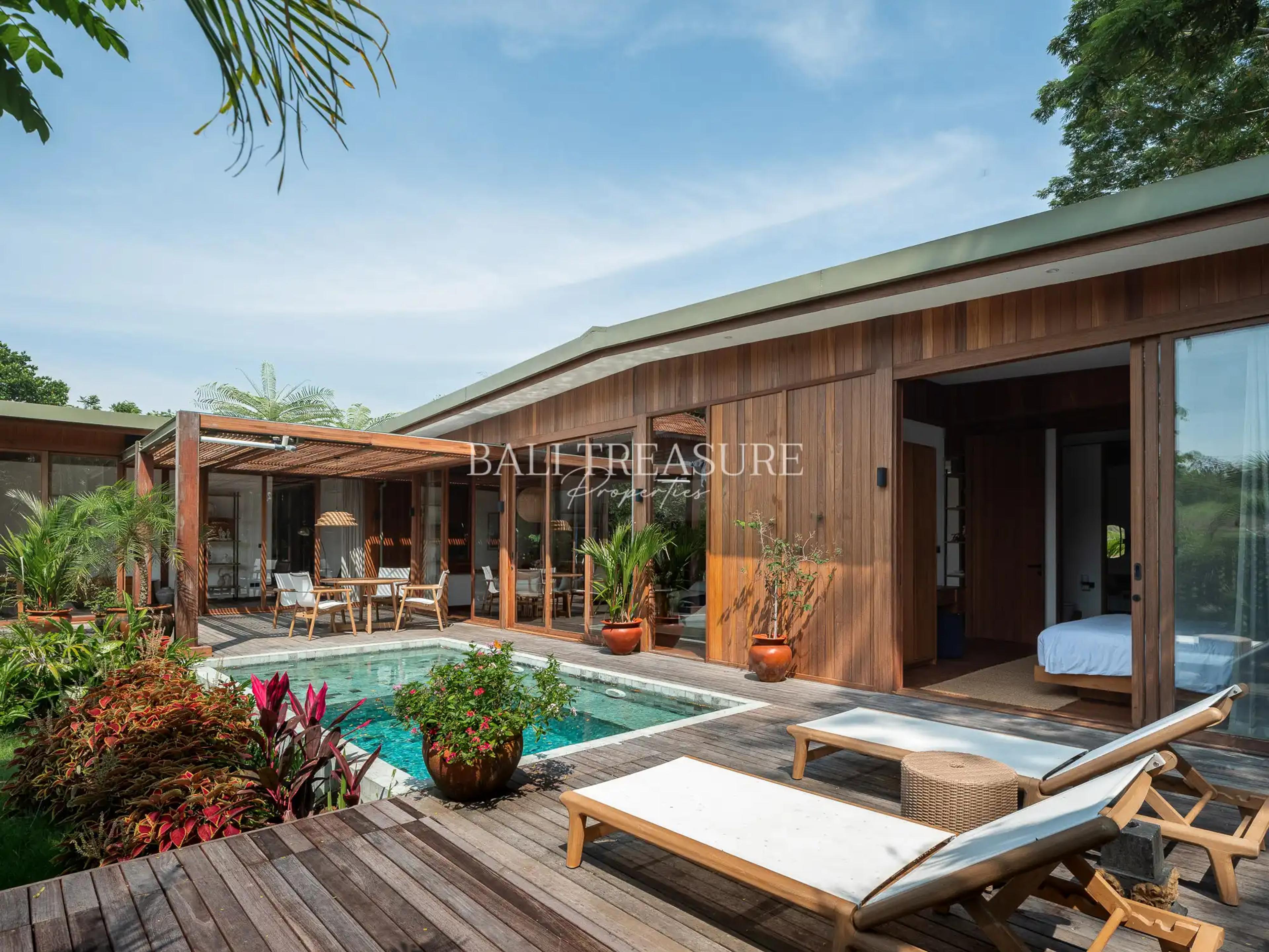 Spanning a 553 sqm land with 300 sqm of living space, this single-story tropical-minimalist villa embodies modern family living. Built by experts with over a decade of experience, and designed by sustainability in mind, it’s a prefab masterpiece featuring teak and bengkirai wood finishes. The home offers 5 spacious bedrooms, 5 bathrooms with a bathtub, a fully equipped kitchen, an office, a private pool (17 sqm), terrace, balcony, and storage. Fully furnished, it seamlessly connects indoor and outdoor spaces, complemented by breathtaking rice field view.