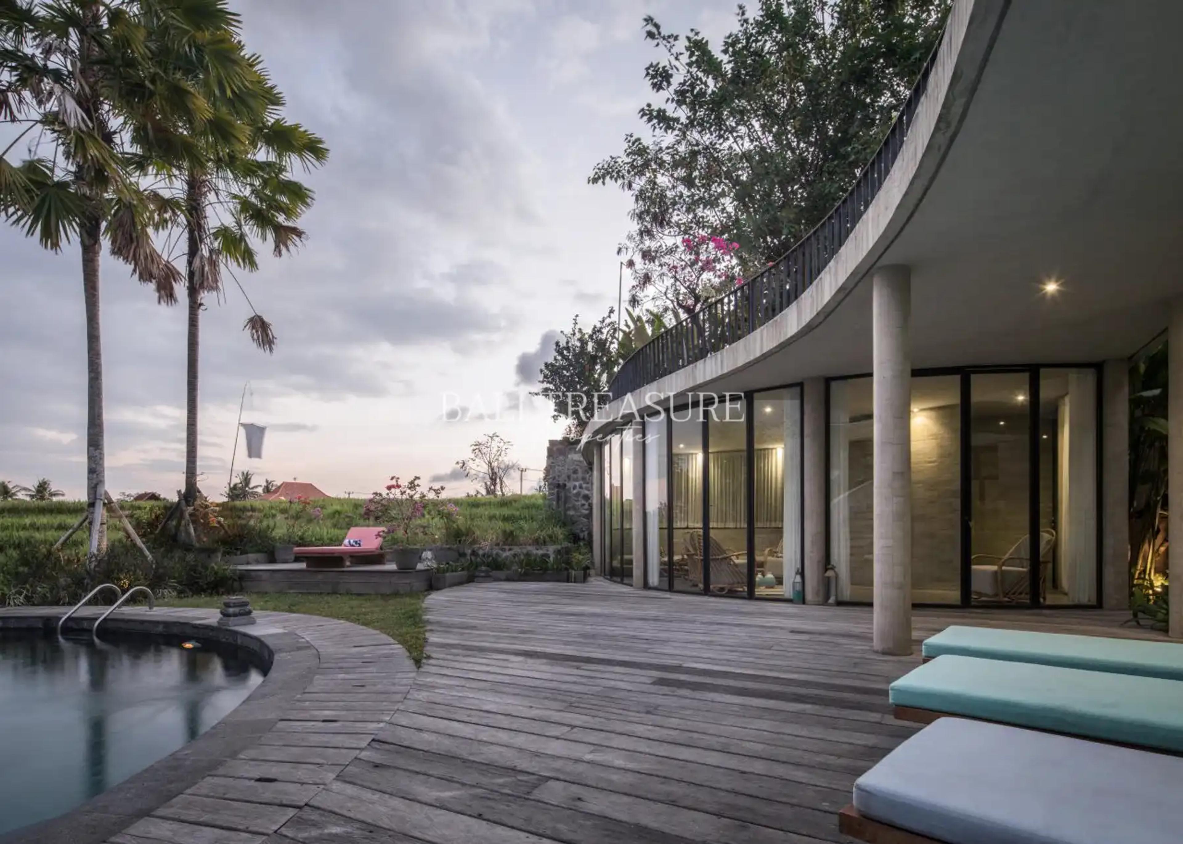 The property offers 4-5 spacious bedrooms with en-suite bathrooms, two of which overlook picturesque rice fields. With an open kitchen, dining area, and a serene music pavilion by the pool, this villa is built for both entertainment and relaxation. The land extends over 704.6 sqm, with an additional 2180 sqm leased to protect the breathtaking views.