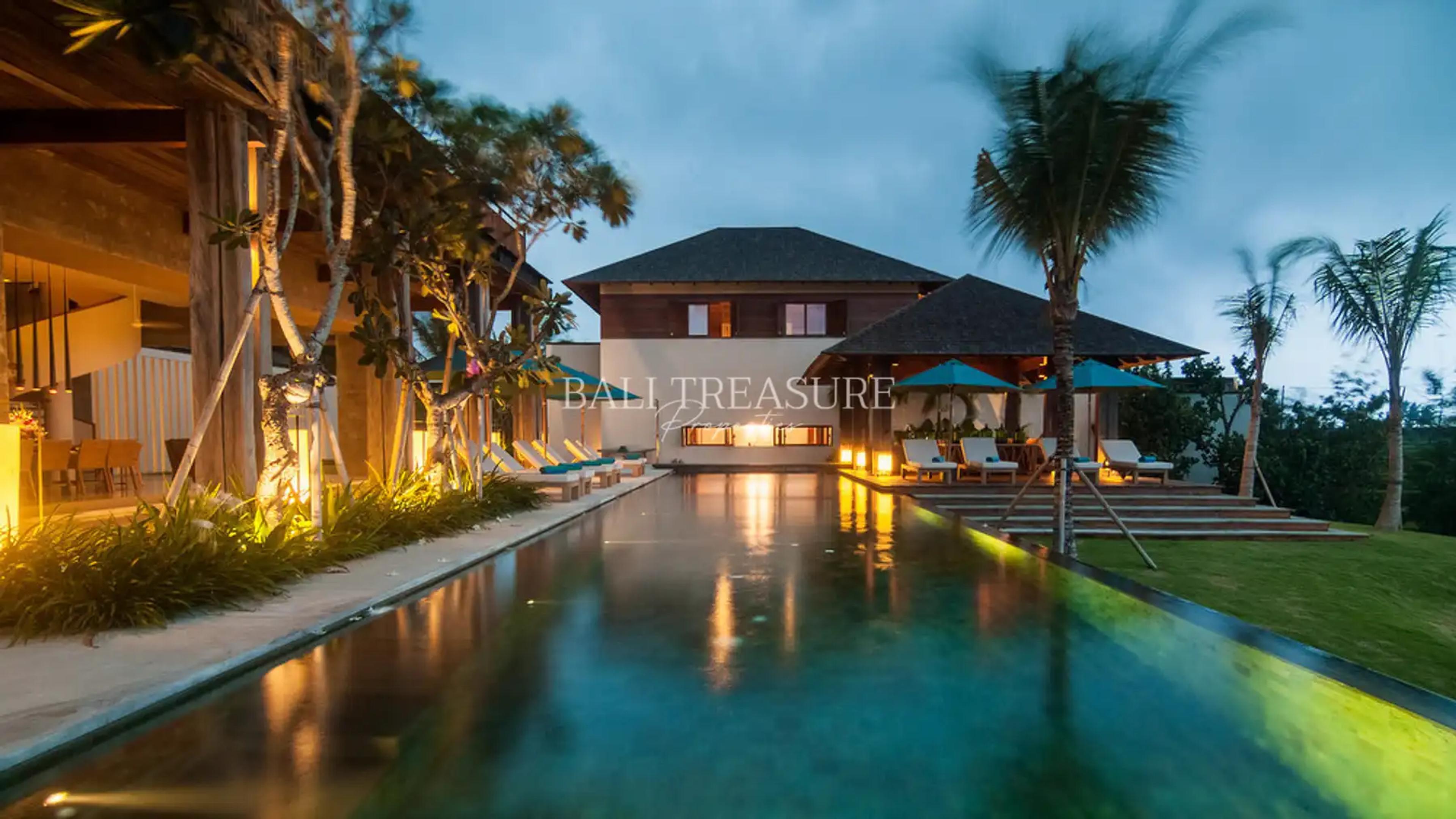 Located in a tranquil village of Tumbak Bayuh, this 6-bedroom villa is raised on a 2300 m2 plot, and has 2180 m2 living space with six en-suite bedrooms of 75 m2 each, indoor and outdoor living spaces, two media rooms, a rooftop, a staff quarter, an incredible 30 m infinity pool into the view along the plot from side to side, a half basketball, a lower level by the river for an exclusive studio – office – home theatre or private gym. Air and natural light can freely enter the area with plenty of open spaces.